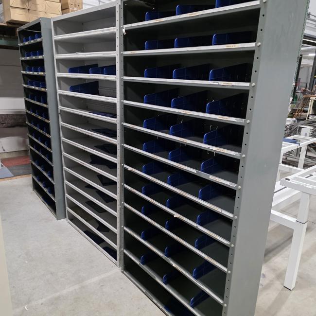 Set van 5 stalen magazijnkasten met scheidingschotten afm 200x100x30 cm