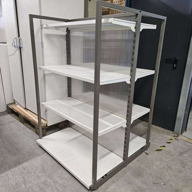 +/- 28 meter Metalen dubbele winkelstelling - 155 cm hoog, 4,03 meter breed, 107 cm diep - minimale afname 4 secties