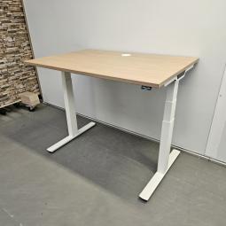 Elektrisch verstelbaar hooglaag bureau. Het bureau beschikt over 2 motoren en is in zeer nette staat. Met eiken kleur houten werkblad en stevig wit metalen frame. De tafel is gemonteerd.